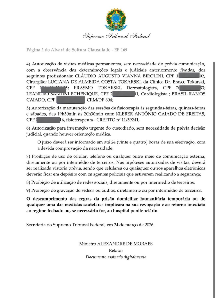 O documento foi expedido logo após a decisão proferida pelo relator, na tarde desta terça-feira (24/3). Com isso, Bolsonaro, quando tiver autorização médica, já poderá seguir o tratamento da broncopneumonia em casa.