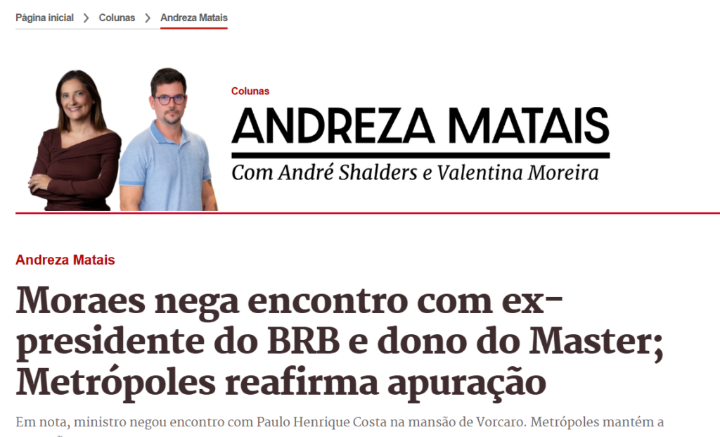 “A matéria do Portal Metrópole sobre uma suposta reunião do Ministro Alexandre de Moraes, acompanhado por um assessor, com o então Presidente do BRB, Paulo Henrique Costa, em um fim de semana do primeiro semestre de 2025, na casa do banqueiro Daniel Vorcaro é falsa e mentirosa. Essa reunião não ocorreu e, lamentavelmente, segue um padrão criminoso de ataques desqualificados contra os integrantes do Supremo Tribunal Federal.”