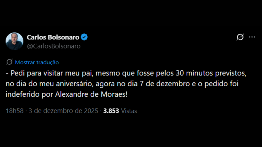 Carlos pediu para visitar seu pai, Jair Bolsonaro, no dia de seu aniversário em 07/12, mas absurdamente o ministro negou o pedido.