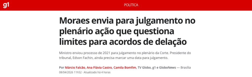O ministro Alexandre de Moraes, do Supremo Tribunal Federal (STF), pediu que a Corte julgue uma ação que discute os limites e a validade dos acordos de delação premiada no Brasil, de acordo com a matéria do G1.