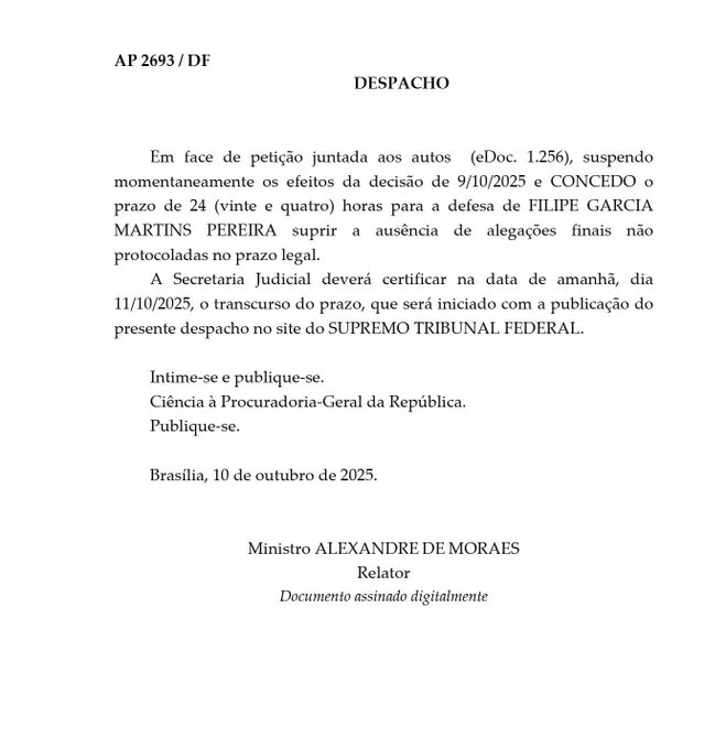 Na nova decisão, o magistrado estabeleceu um período de 24 horas para que a defesa de Filipe Martins se manifeste sobre as alegações finais.”Em face de petição juntada aos autos (…), suspendo momentaneamente os efeitos da decisão de 9/10/2025 e concedo o prazo de 24 horas para a defesa de Filipe Garcia Martins Pereira suprir a ausência de alegações finais não protocoladas no prazo legal.