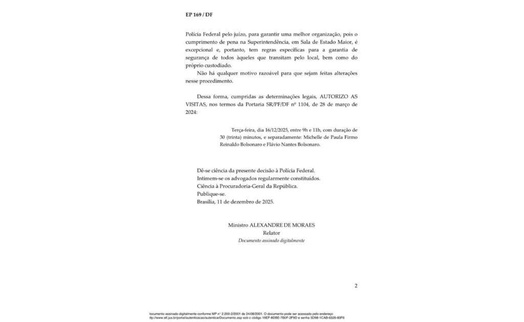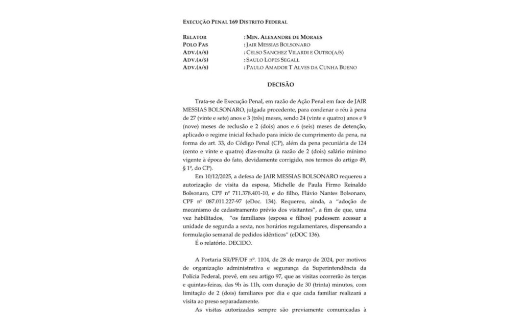 Recentemente, Moraes autorizou visitas específicas, como as de Michelle e Flávio Bolsonaro para 16 de dezembro, mas rejeitou alterações no procedimento padrão.