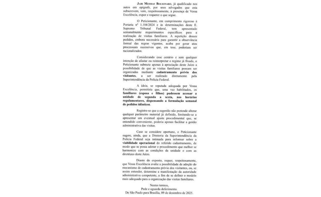 Os advogados argumentaram pela simplificação administrativa, propondo o cadastramento prévio somente de Michelle Bolsonaro e dos filhos diretamente na Superintendência da PF, permitindo visitas de segunda a sexta-feira, nos horários regulamentares (das 9h às 11h), sem novos pedidos judiciais repetitivos.