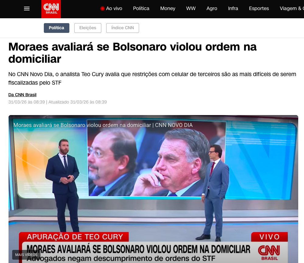 O ministro Alexandre de Moraes, do Supremo Tribunal Federal (STF), vai avaliar se o presidente Jair Bolsonaro violou alguma das restrições impostas em sua prisão domiciliar. A análise foi aberta após Eduardo Bolsonaro mencionar, durante evento nos Estados Unidos, que gravava um vídeo para mostrar ao pai.