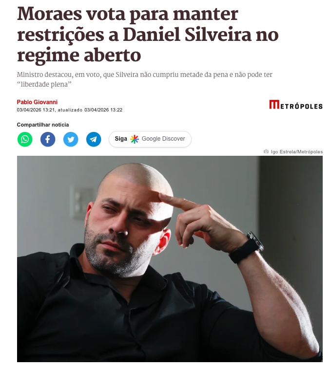 O ministro Alexandre de Moraes, do Supremo Tribunal Federal (STF), votou para manter as restrições impostas ao ex-deputado federal Daniel Silveira (PTB-RJ) no regime aberto, de acordo com a matéria do Metrópoles.