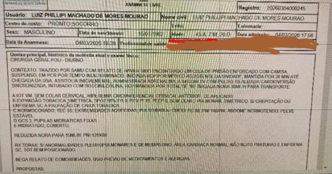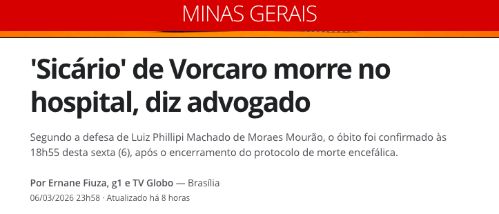 A Secretaria de Estado de Saúde de Minas Gerais confirmou nesta sexta-feira (6 de março de 2026) a morte de Luiz Phillipi Machado de Moraes Mourão, conhecido como “Sicário”, preso preventivamente na Operação Compliance Zero.