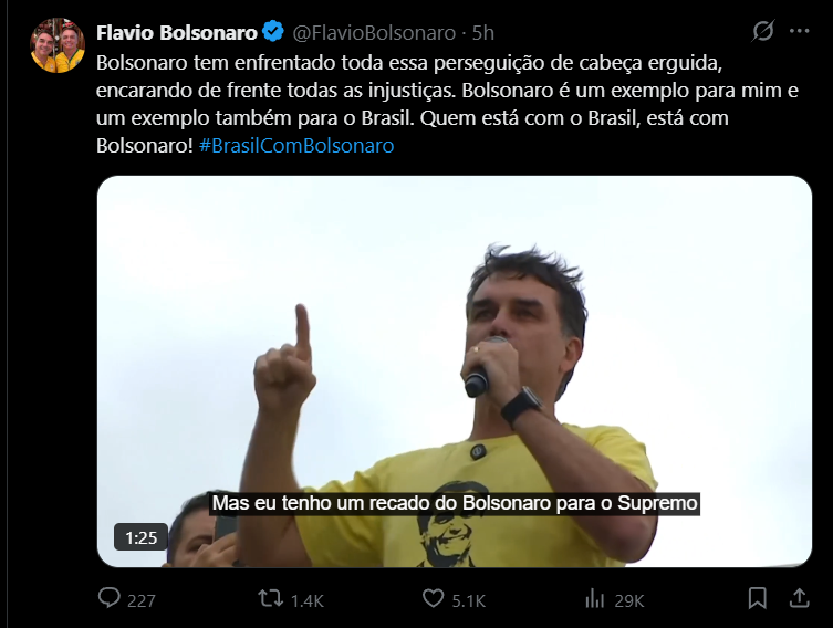 No mesmo evento de 7 de Setembro em Copacabana, Rio de Janeiro, o senador Flávio Bolsonaro (PL-RJ) reiterou que o ex-presidente Jair Bolsonaro (PL) não está sendo submetido a um processo judicial no STF, mas a um “linchamento” judicial.