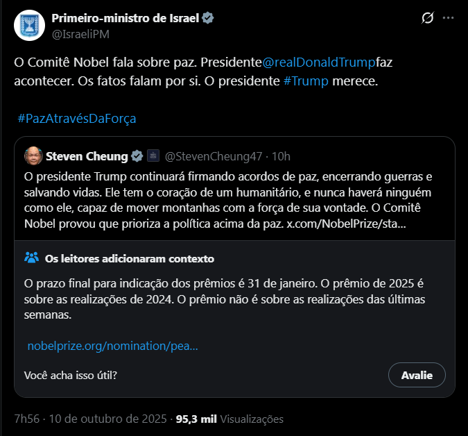 O escritório do primeiro-ministro de Israel, Benjamin Netanyahu, declarou, nesta sexta-feira (10/10), que, enquanto o Comitê Norueguês do Nobel discorre sobre paz, o presidente dos Estados Unidos, Donald Trump, “faz acontecer”. A afirmação veio após a concessão do prêmio à líder da oposição venezuelana, María Corina Machado.