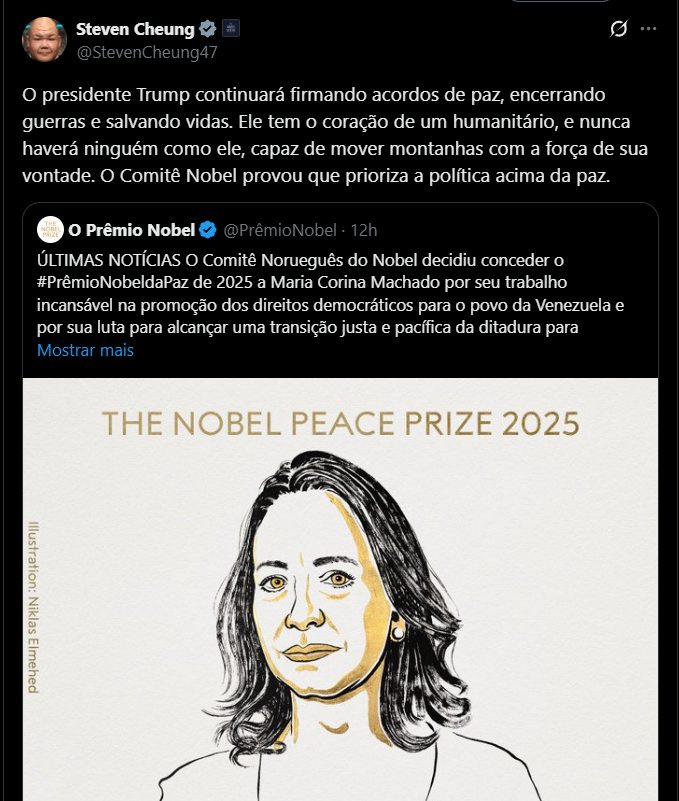 Trump merece o reconhecimento devido aos seus esforços para encerrar o conflito no Oriente Médio, na Faixa de Gaza, envolvendo Israel e o Hamas. Trump também colocou fim a sete guerras.Na mesma plataforma, Steven Cheung, diretor de Comunicação do governo americano, criticou o Comitê Norueguês do Nobel, afirimando que este colocou “a política acima da paz”.