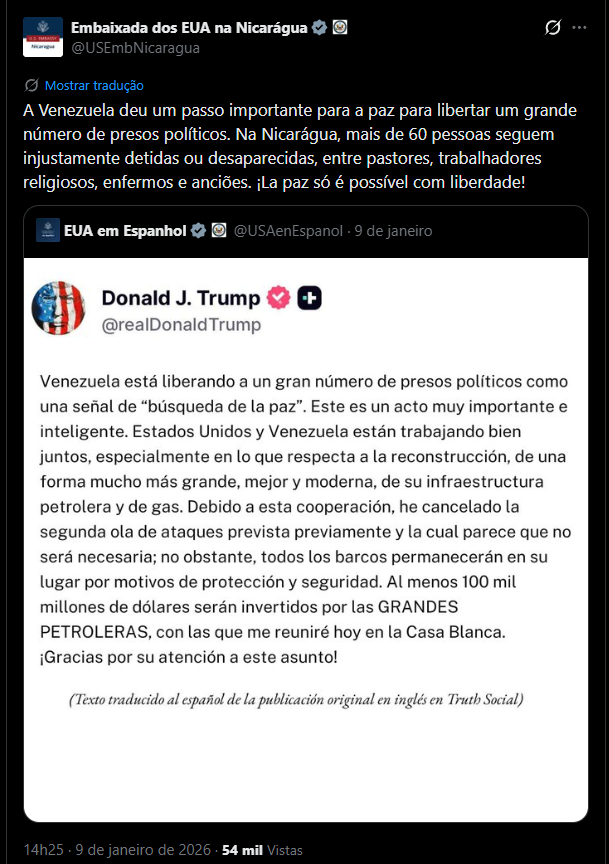 Entre outros motivos, isso se deve ao fato de terem expressado apoio à captura do ex-presidente venezuelano Nicolás Maduro , um aliado fiel do presidente e vice-presidente da Nicarágua, Daniel Ortega e Rosario Murillo.