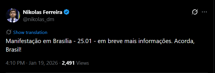 Nikolas também fez uma convocação para manifestação em Brasília, confira: