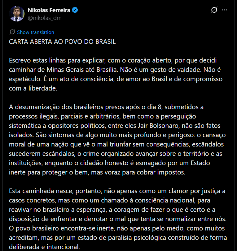 CONFIRA A CARTA ABERTA DE NIKOLAS PARA POVO BRASILEIRO:
