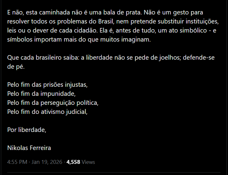 Em vídeo publicado nas redes sociais, onde anunciou o início da jornada após cumprir agenda oficial em Paracatu (MG), próximo à divisa com Goiás, Nikolas Ferreira declarou: “Caminhada pela liberdade e justiça. Acorda, Brasil.”