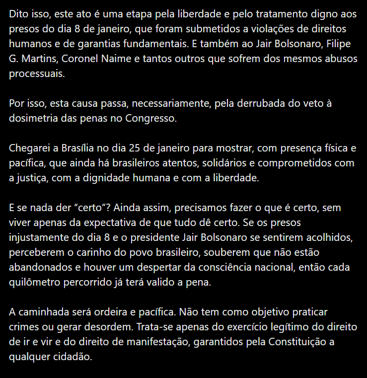 No mesmo material, o deputado reforçou o caráter motivacional da ação, afirmando que decidiu caminhar para “trazer luz a todos os fatos que estão acontecendo” e “dar esperança para aqueles que já desistiram”. Ele completou: “Tomaram tudo da gente, mas não tomaram nossa voz”.