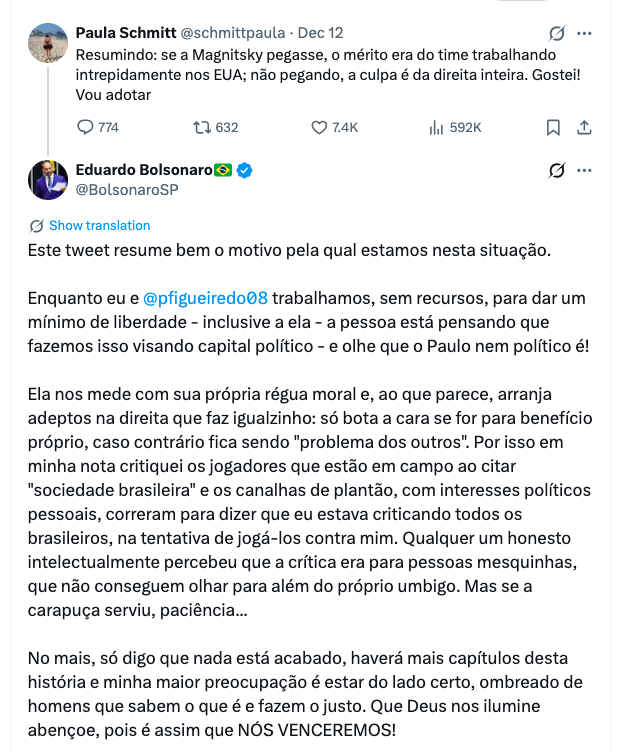 “Enquanto eu e o Paulo Figueiredo trabalhamos, sem recursos, para dar um mínimo de liberdade, inclusive a ela, a pessoa está pensando que fazemos isso visando capital político, e olhe que o Paulo nem político é! Ela nos mede com sua própria régua moral e, ao que parece, arranja adeptos na direita que faz igualzinho: só bota a cara se for para benefício próprio, caso contrário fica sendo ‘problema dos outros’”, escreveu o deputado.