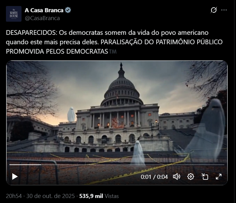 O governo Trump não perdeu a oportunidade e criticou os DEMOCRATAS que atrapalha a vida dos americanos insistindo no SHOTDOWN, confirma o que a CASA BRANCA publicou em dia de Halloween.
