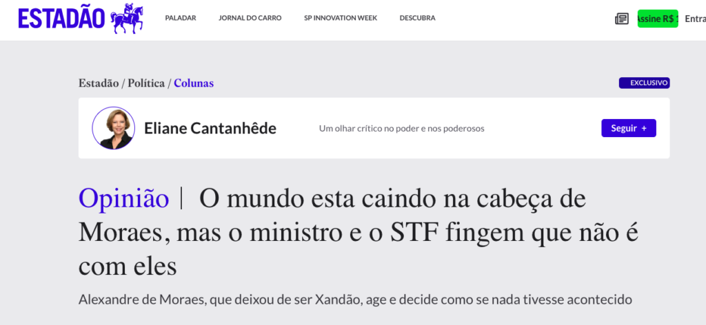 A colunista Eliane Cantanhede, do Estadão, afirma que o ministro Alexandre de Moraes e o Supremo Tribunal Federal (STF) agem como se nada estivesse acontecendo, apesar das graves denúncias que envolvem o magistrado no escândalo do Banco Master.