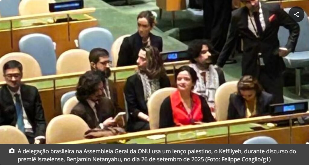 A delegação brasileira, liderada pelo Lula da Silva (que já havia criticado Israel em discursos anteriores na ONU), retirou-se em massa do salão da Assembleia Geral logo no início do discurso de Netanyahu, em 26 de setembro de 2025. Os diplomatas brasileiros foram vistos usando a tradicional keffiyeh palestina (lenço quadriculado), um símbolo de solidariedade à causa palestina, em um gesto coordenado com outras nações (como as que reconheceram recentemente o Estado palestino).