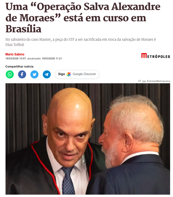Uma operação sigilosa estaria em andamento em Brasília com o objetivo de blindar o ministro Alexandre de Moraes, do Supremo Tribunal Federal (STF), de acusações e pressões políticas e internacionais. A informação foi divulgada pela coluna de Mário Sabino no Metrópoles, que aponta movimentações coordenadas entre aliados do magistrado e setores do governo federal.