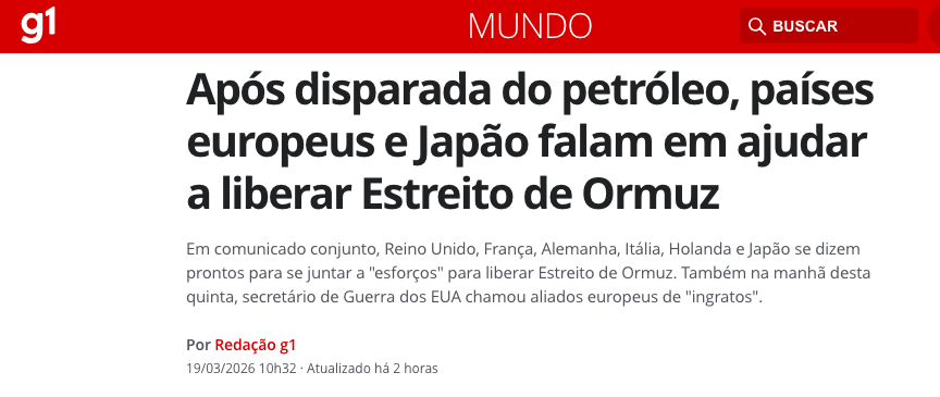 Países europeus e o Japão declararam estar prontos para ajudar na garantia de segurança no Estreito de Ormuz, rota vital por onde passa cerca de 20% do petróleo mundial, conforme noticiado pelo G1.