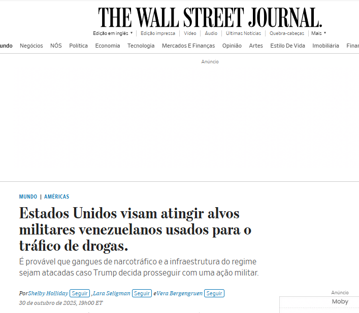 O ‘Wall Street Journal’ também noticiou os planos da Casa Branca na noite desta quinta-feira. “Os EUA estão de olho em alvos militares venezuelanos usados para o tráfico de drogas. A infraestrutura dos cartéis de drogas e do regime de [Nicolás Maduro] provavelmente será alvo se Trump decidir tomar medidas militares”, informou o jornal.