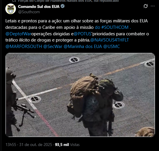 Em uma publicação na rede social, o Comando Sul dos EUA anunciou que a operação tinha como prioridade “combater o tráfico ilício de drogas e proteger a pátria”.