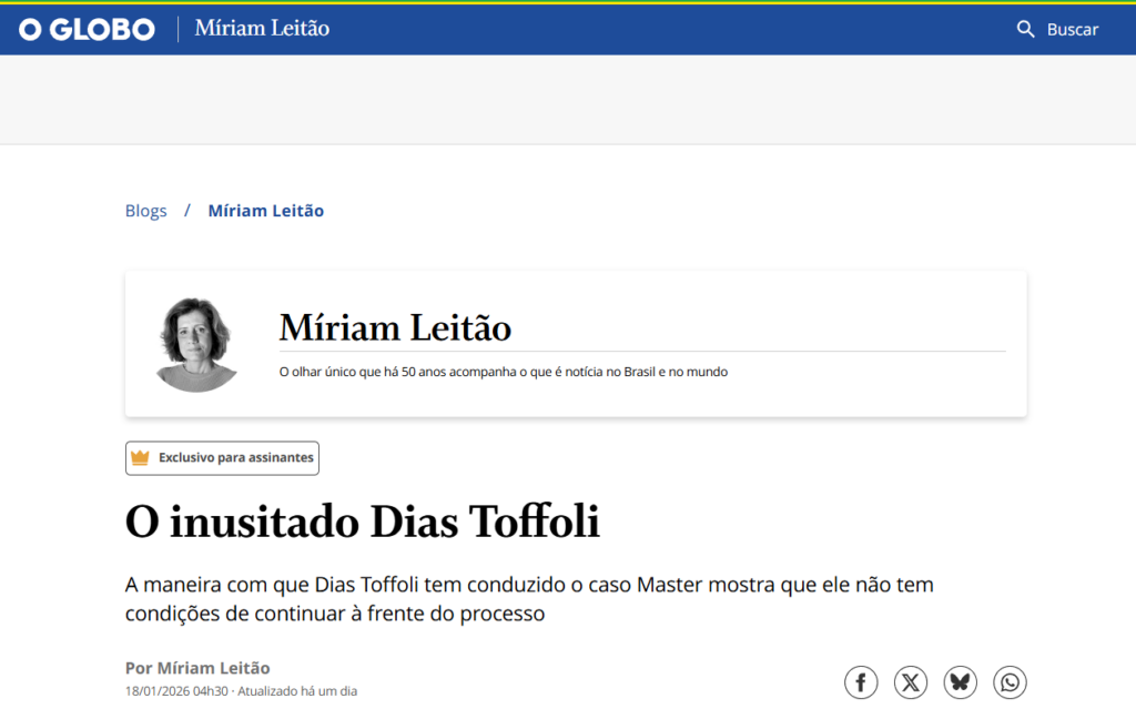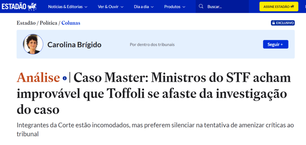 De acordo com relatos colhidos por colunistas, como Lauro Jardim, do jornal O Globo, cresce o consenso de que a permanência de Toffoli na relatoria se tornou insustentável do ponto de vista político e jurídico.
