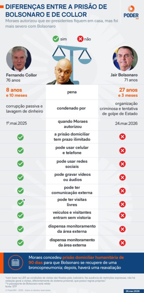 Alexandre de Moraes autorizou, em 24 de março, domiciliar para o presidente Jair Bolsonaro (PL), 71 anos, e determinou medidas cautelares mais rígidas do que as que foram impostas ao ex-presidente Fernando Collor de Mello, 76 anos, em maio de 2025, sobretudo sobre comunicação e visitas.