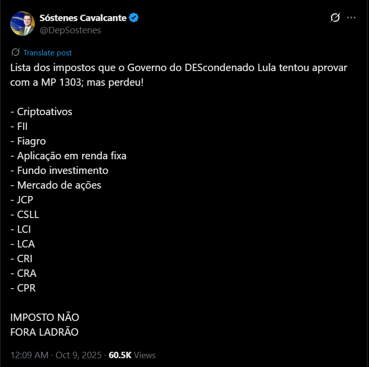 Confira a Lista dos impostos que o Governo do DEScondenado Lula tentou aprovar com a MP 1303; mas perdeu, conforme postagem abaixo do Líder do PL SÓSTENES CAVALLCANTE: