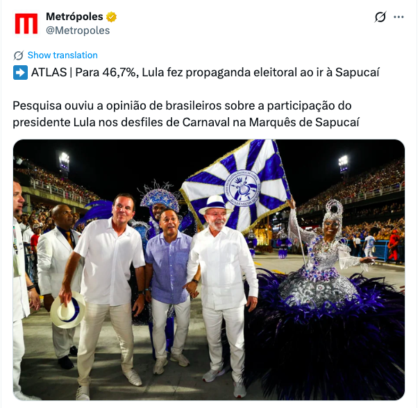A pesquisa AtlasIntel/Bloomberg revelou que 46,7% dos brasileiros consideram que a presença do petista Lula da Silva no desfile da Acadêmicos de Niterói, na Marquês de Sapucaí, configurou propaganda eleitoral antecipada.