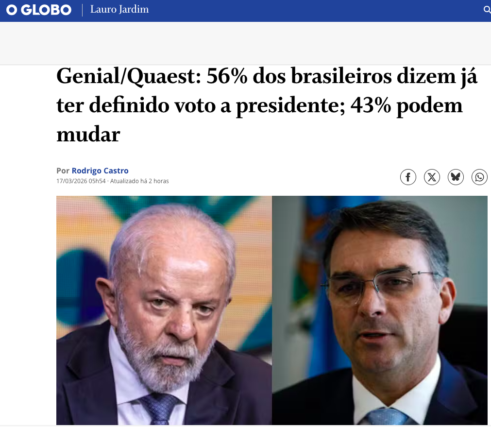 Uma nova rodada da pesquisa Genial/Quaest, divulgada nesta segunda-feira (16), indica que 56% dos brasileiros já definiram seu voto para presidente nas eleições de 2026. Ao mesmo tempo, 43% afirmam que ainda podem mudar de candidato até o dia da votação, de acordo com a matéria do O GLOBO.