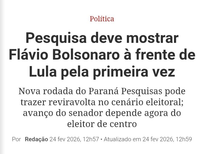 Uma nova pesquisa do instituto Paraná Pesquisas pode registrar, pela primeira vez, o senador Flávio Bolsonaro (PL-RJ) à frente do petista Lula da Silva nas intenções de voto para as eleições presidenciais de 2026. A antecipação foi feita pelo colunista Robson Bonin, da coluna Radar da VEJA, durante o programa Ponto de Vista, nesta terça-feira (24), e reforça o movimento de crescimento observado nas últimas sondagens.
