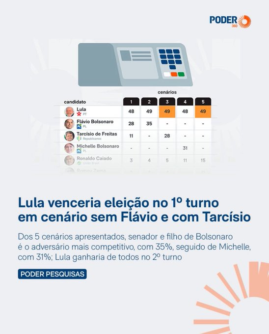 Pesquisa realizada entre 15 e 20 de janeiro, aponta que o petista Lula supostamente venceria no primeiro turno em um cenário específico: sem a presença do senador Flávio Bolsonaro (PL-RJ) como candidato e com o governador de São Paulo, Tarcísio de Freitas (Republicanos), na disputa.