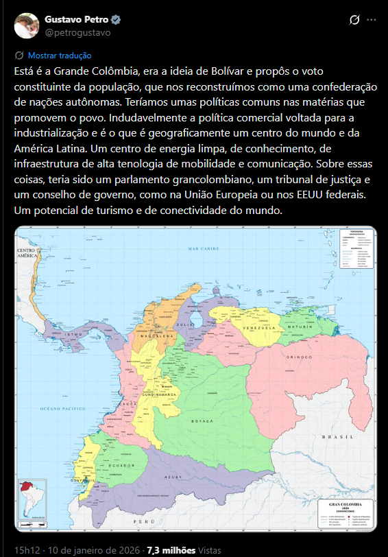 “Está es la Gran Colombia, era la idea de Bolívar y propongo por voto constituyente de la población, que la reconstruyamos como una confederación de Naciones autónomas” — escreveu o presidente em publicação no X, que rapidamente gerou debates intensos na região.