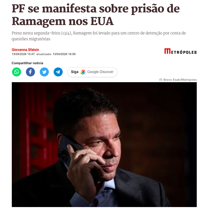 A Polícia Federal (PF) se manifestou oficialmente sobre a detenção de Alexandre Ramagem (PL-RJ) nos Estados Unidos, ocorrida nesta segunda-feira (13). O deputado federal foi detido pelo Serviço de Imigração e Controle de Aduanas (ICE) em Orlando, na Flórida, de acordo com a matéria do Metrópoles.