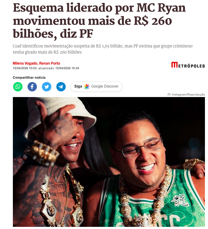 A Polícia Federal deflagrou nesta quarta-feira (15 de abril de 2026) a Operação Narco Fluxo, que investiga um grande esquema de lavagem de dinheiro supostamente liderado pelo cantor Ryan Santana dos Santos, conhecido como MC Ryan SP. Segundo decisão judicial, o grupo criminoso movimentou mais de R$ 260 bilhões, de acordo com a matéria do Metrópoles.