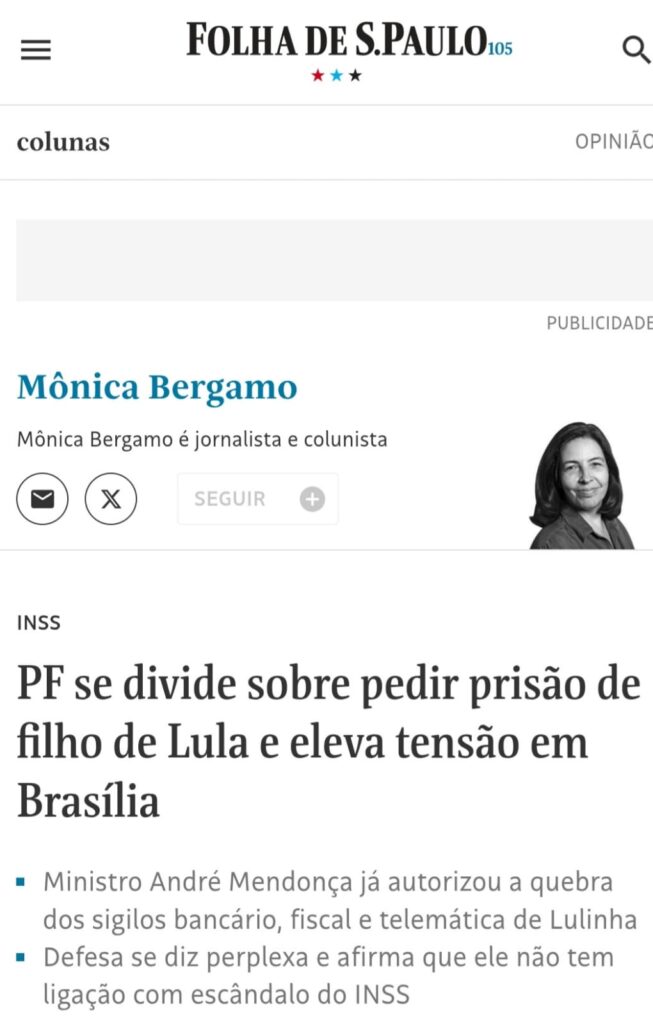 O impasse interno da corporação tem gerado atrito com a Procuradoria-Geral da República e com o Supremo Tribunal Federal, onde o inquérito tramita. A divisão reflete o alto grau de sensibilidade política do caso, que cruza com as apurações da CPMI do INSS sobre o lobista Antônio Carlos Camilo Antunes (“Careca do INSS”) e possíveis conexões com Lulinha.