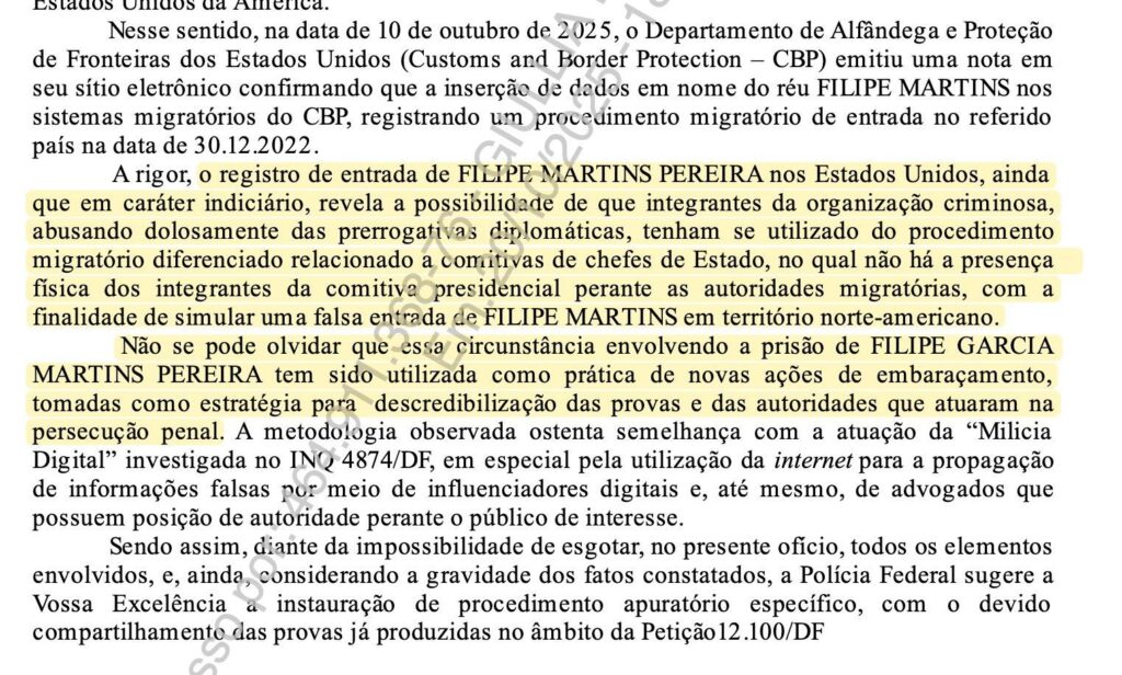 A PF afirma, ainda, que Filipe G Martins e a defesa dele têm supostamente utilizado o episódio para descredibilizar provas produzidas na investigação e que a alegada simulação tem semelhança com a prática das supostas milícias digitais, já investigadas em outro inquérito conduzido pelo ministro Alexandre de Moraes.