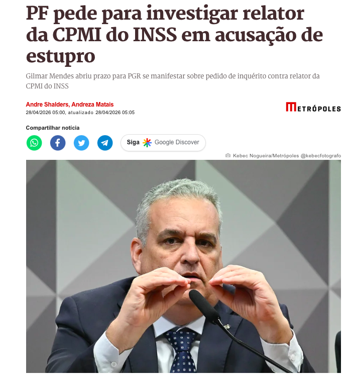 A Polícia Federal solicitou ao Supremo Tribunal Federal (STF) autorização para investigar o deputado federal Alfredo Gaspar (União Brasil-AL), relator da CPMI do INSS no Congresso Nacional. O pedido de inquérito tem como base uma representação protocolada pelos parlamentares Lindbergh Farias (PT-RJ) e Soraya Thronicke (Podemos-MS), que acusam o deputado de estupro.