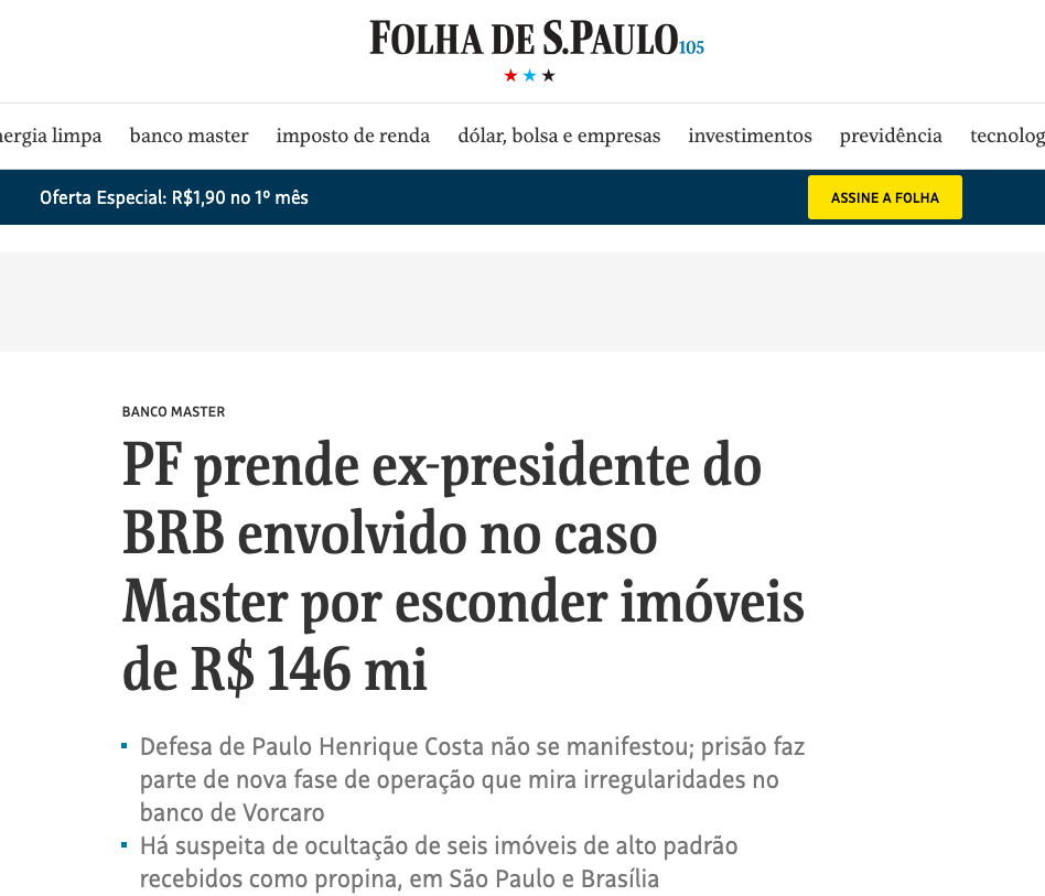 A Polícia Federal prendeu nesta quinta-feira (16) o ex-presidente do Banco de Brasília (BRB), Paulo Henrique Costa, em mais uma fase da Operação Compliance Zero. A ação investiga irregularidades na relação entre o banco público e o Banco Master, controlado pelo empresário Daniel Vorcaro, de acordo com a matéria da Folha de São Paulo.