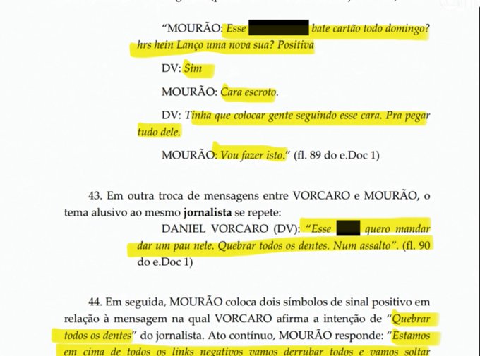 A PF aponta que Mourão recebia cerca de R$ 1 milhão por mês para coordenar o esquema. Mensagens interceptadas revelam ordens diretas de Vorcaro para ações violentas e ilegais, como monitoramento e intimidação de críticos.