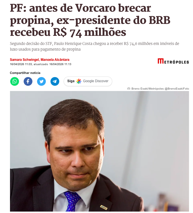 A Polícia Federal identificou que o ex-presidente do Banco de Brasília (BRB), Paulo Henrique Costa, já havia recebido pagamentos concretos superiores a R$ 74,6 milhões em imóveis de luxo antes que o empresário Daniel Vorcaro, dono do Banco Master, determinasse a interrupção do restante da propina.