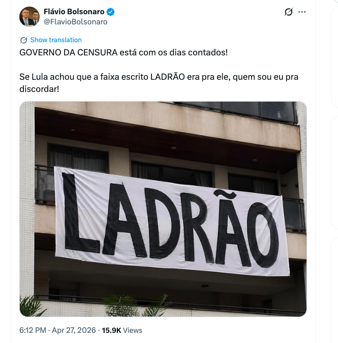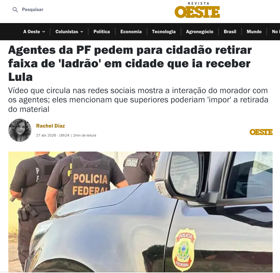 Uma equipe da Polícia Federal (PF) interveio na manhã desta segunda-feira (27) em uma propriedade privada em Santa Catarina, onde o petista Lula da Silva cumpre agenda oficial. Os agentes solicitaram a um cidadão a retirada de uma faixa instalada em sua residência que continha a palavra “ladrão”.
