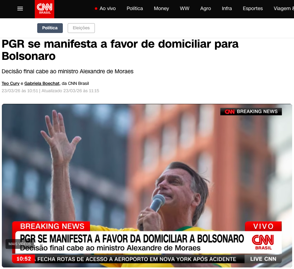 O procurador-geral da República, Paulo Gonet, manifestou-se nesta segunda-feira (23) a favor da concessão de prisão domiciliar ao presidente Jair Bolsonaro (PL). O parecer foi enviado ao ministro Alexandre de Moraes, do Supremo Tribunal Federal (STF), relator do processo de execução penal, de acordo com a matéria da CNN BRASIL.