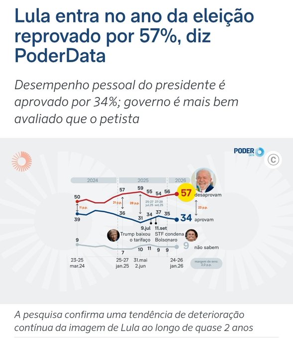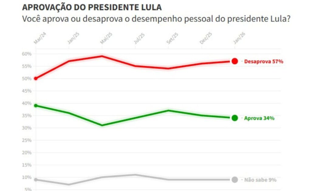 Pesquisa PoderData revela desaprovação de 57% ao desempenho pessoal do presidente Lula no início de 2026