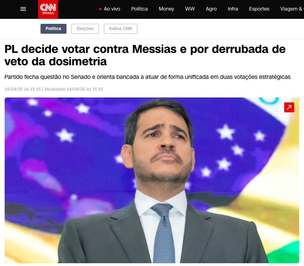O Partido Liberal (PL) no Senado Federal anunciou, nesta terça-feira (14 de abril de 2026), o fechamento de questão em duas votações consideradas prioritárias pela legenda. A orientação é para que a bancada vote de forma unificada contra a indicação de Jorge Messias para vaga no Supremo Tribunal Federal (STF) e a favor da derrubada do veto presidencial relacionado à dosimetria das penas, de acordo com a matéria da CNN BRASIL.