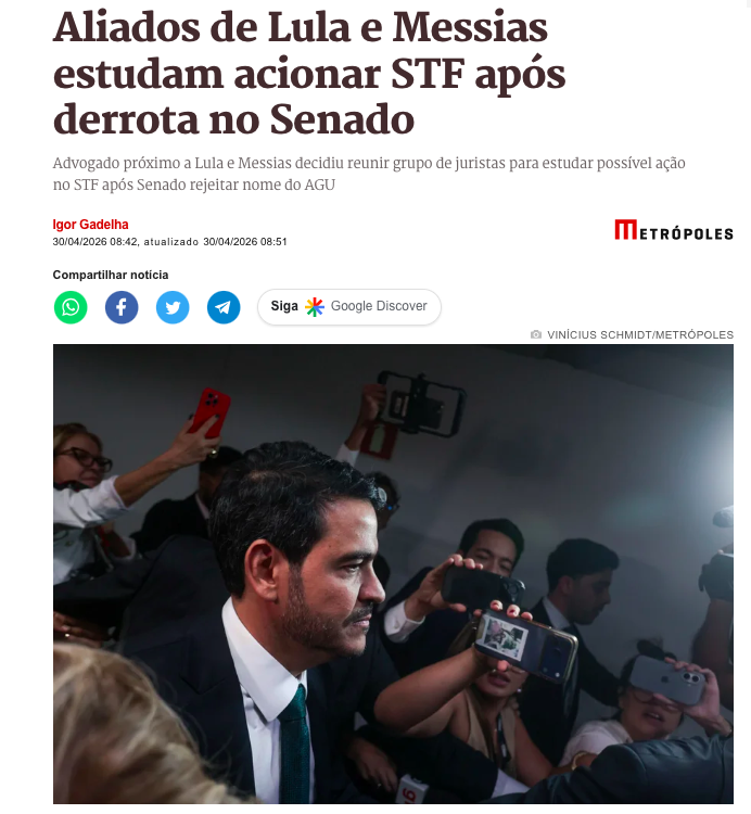 Apesar do discurso público de aceitação da derrota, aliados do petista Lula da Silva e do advogado-geral da União, Jorge Messias, já estudam recorrer ao Supremo Tribunal Federal (STF) após a rejeição da indicação de Messias ao STF pelo Senado.