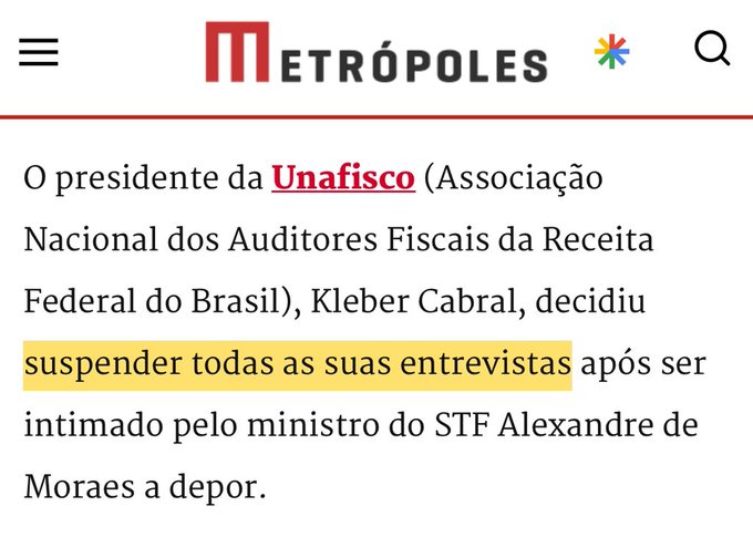Em mais um episódio que escancara o clima de intimidação no Judiciário, o presidente da Unafisco Nacional (Associação Nacional dos Auditores Fiscais da Receita Federal), Kléber Cabral, decidiu suspender todas as suas entrevistas à imprensa. A medida drástica veio logo após intimação do ministro Alexandre de Moraes, do Supremo Tribunal Federal (STF), para que ele preste depoimento à Polícia Federal (PF) nesta sexta-feira (20), às 15h.
