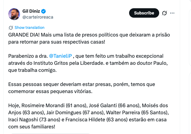 Mais um grupo de presos políticos injustamente condenados pelos atos de 8 de janeiro deixou a prisão para retornar ao convívio familiar. A notícia foi celebrada pelo deputado federal Gil Diniz, que destacou a libertação como uma “pequena vitória” em meio a uma luta que, segundo ele, nunca deveria ter chegado a esse ponto.