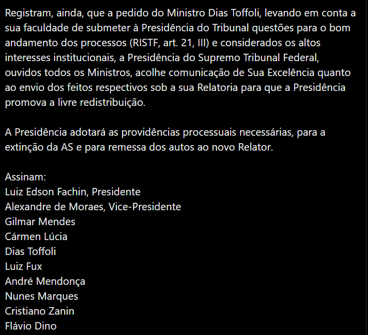 A decisão veio após uma reunião entre os ministros da Corte e foi motivada pelos progressos na apuração conduzida pela Polícia Federal. Em comunicado oficial, o STF explicou que o ministro – “considerados os altos interesses institucionais” – solicitou a redistribuição do tema para outro relator.